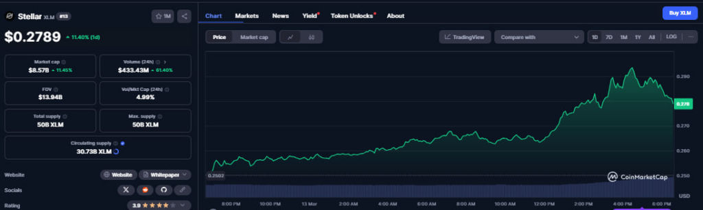 The altcoin changes hands at $0.2789 after an 11.40% increase in the previous 24 hours.